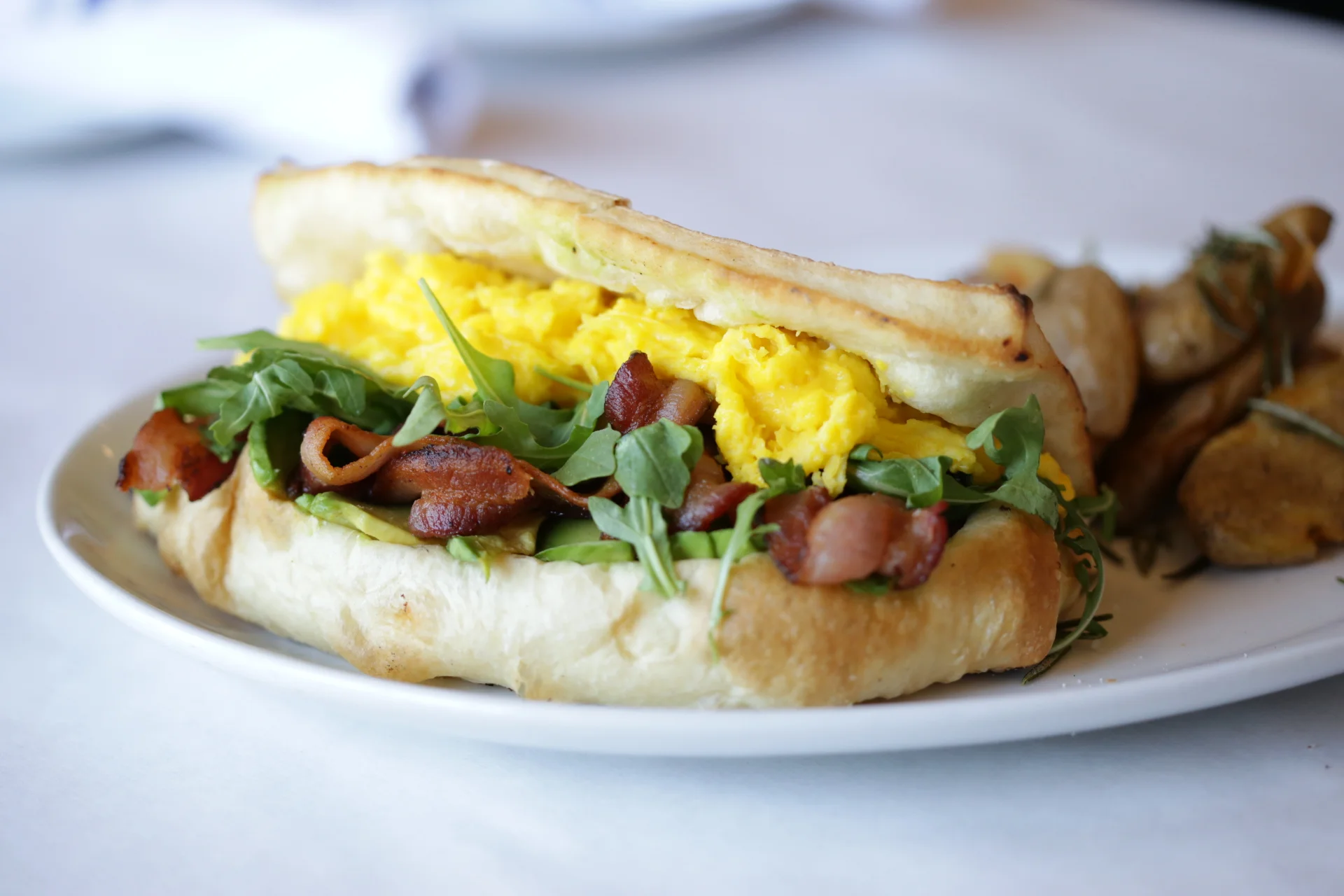 Poached egg, crisp bacon, hollandaise, herb-roasted potatoes or fruit
